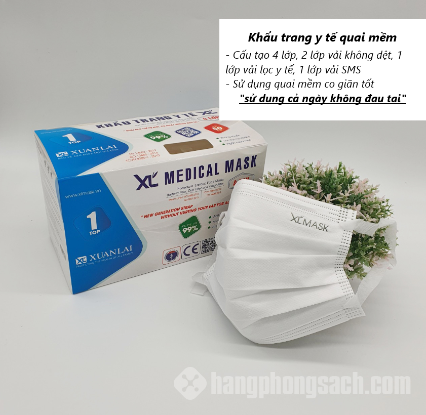 Khẩu trang y tế quai mềm XL Mask Được thiết kế thông minh quai vải mềm đeo cả ngày không đau tai cùng với thanh tựa mũi linh hoạt và dây thun co giãn giúp bạn điều chỉnh cho vừa vặn với khuôn mặt của người sử dụng. Sản phẩm được đóng gói lần lượt là mỗi thùng 50 hộp, mỗi hộp 50 chiếc/túi bóng. Đặc biệt, với ưu điểm kháng khuẩn an toàn cho sức khỏe, khẩu trang XL mask còn là vật dụng chuyên dụng cho các nhân viên ngành y tế. Khẩu trang y tế XL được làm từ chất liệu vải tự nhiên (không dệt poly propylene PP) có tính kháng khuẩn và chống độc cao, tuyệt đối an toàn cho sức khỏe. Sản phẩm thích hợp cho mọi đối tượng, đặc biệt là nhân viên ngành y tế.
